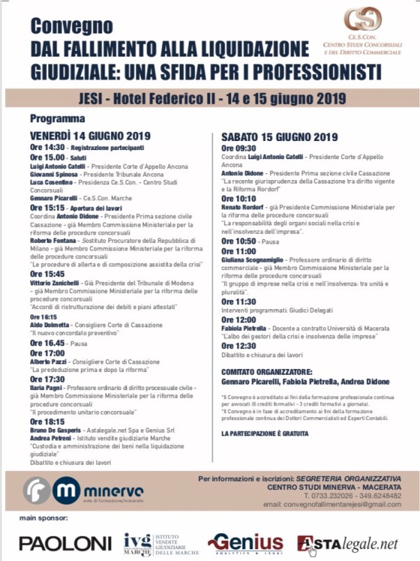 Il prossimo 14 e 15 giugno, a Jesi, si terrà un interessante convegno, con autorevoli relatori, sulla recente modifica della disciplina della crisi e dell’insolvenza.