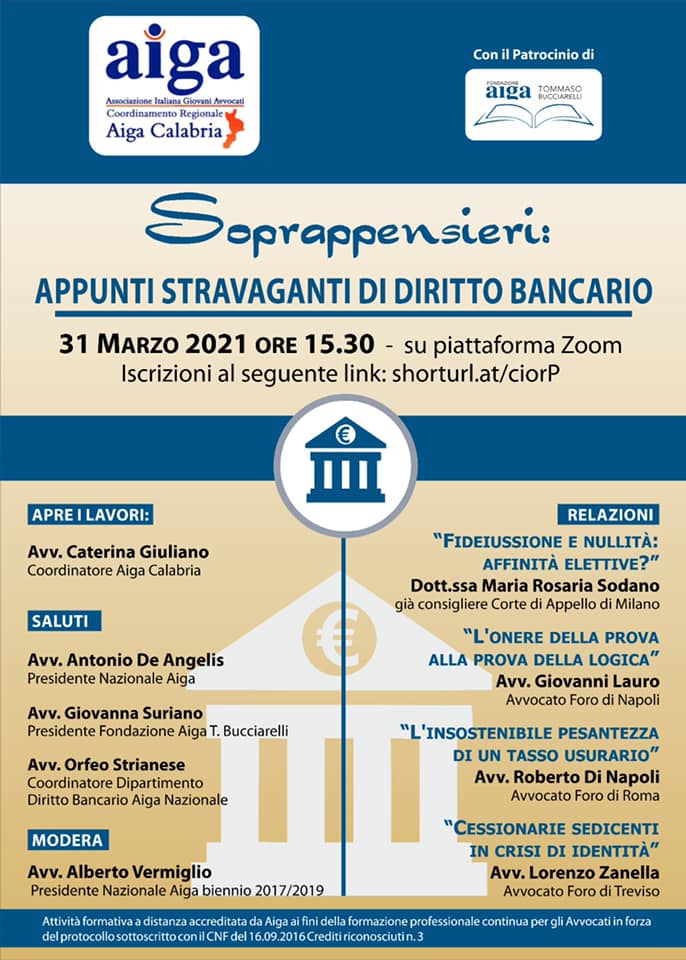 Questo pomeriggio, a partire dalle ore 15,30, si terrà l’interessante webinar (sulla piattaforma Zoom) organizzato da Aiga (Associazione Italiana Giovani Avvocati). Ringrazio dell’invito Aiga, il Presidente Nazionale Avv. Antonio De Angelis, il Coordinatore Aiga Calabria avv. Caterina Giuliano, il Presidente della Fondazione Aiga Avv. Giovanna Suriano, il Coordinatore del Dipartimento di diritto bancario Avv. Orfeo Strianese .