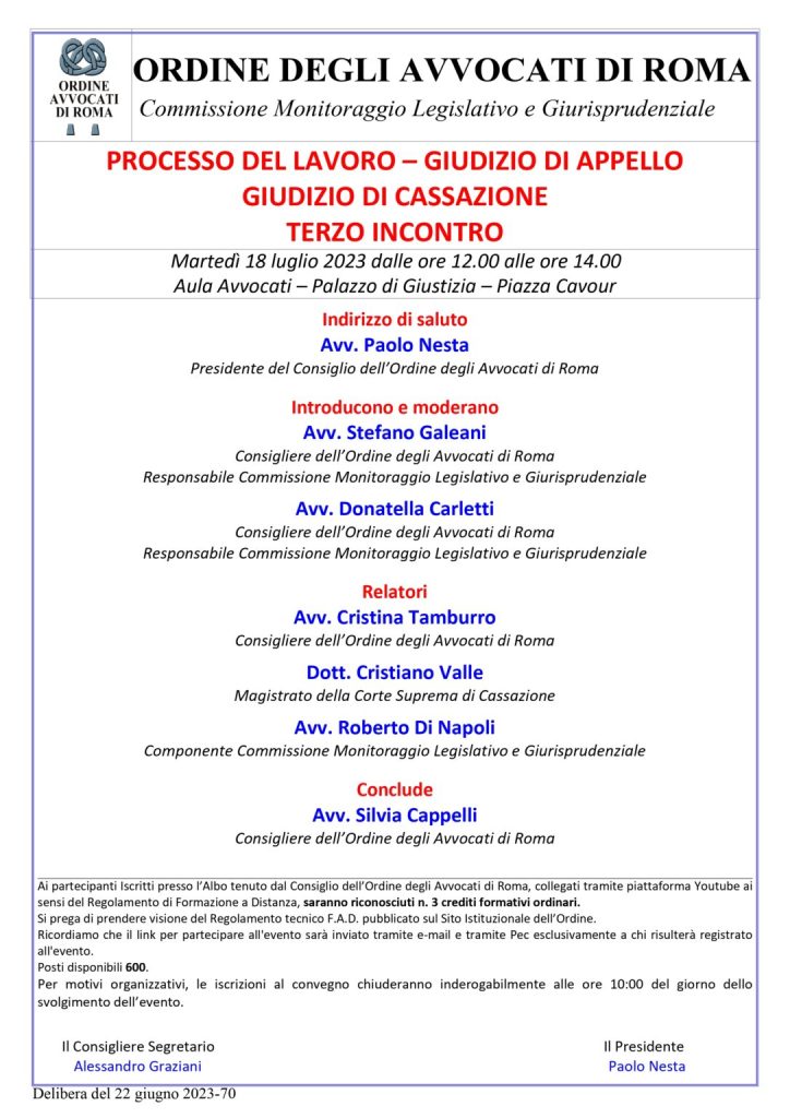 Pubblico di seguito il video -pubblicato sul canale YouTube del Consiglio dell’Ordine degli Avvocati di Roma- del seminario tenutosi martedì 18 luglio 2023 (con partecipanti in collegamento da remoto e con riconoscimento di crediti per la formazione continua) sulle modifiche introdotte dal d.lgs. 10 ottobre 2022 n. 149 (cosiddetta riforma Cartabia) relativamente al processo del lavoro, al giudizio di appello e in Cassazione.
