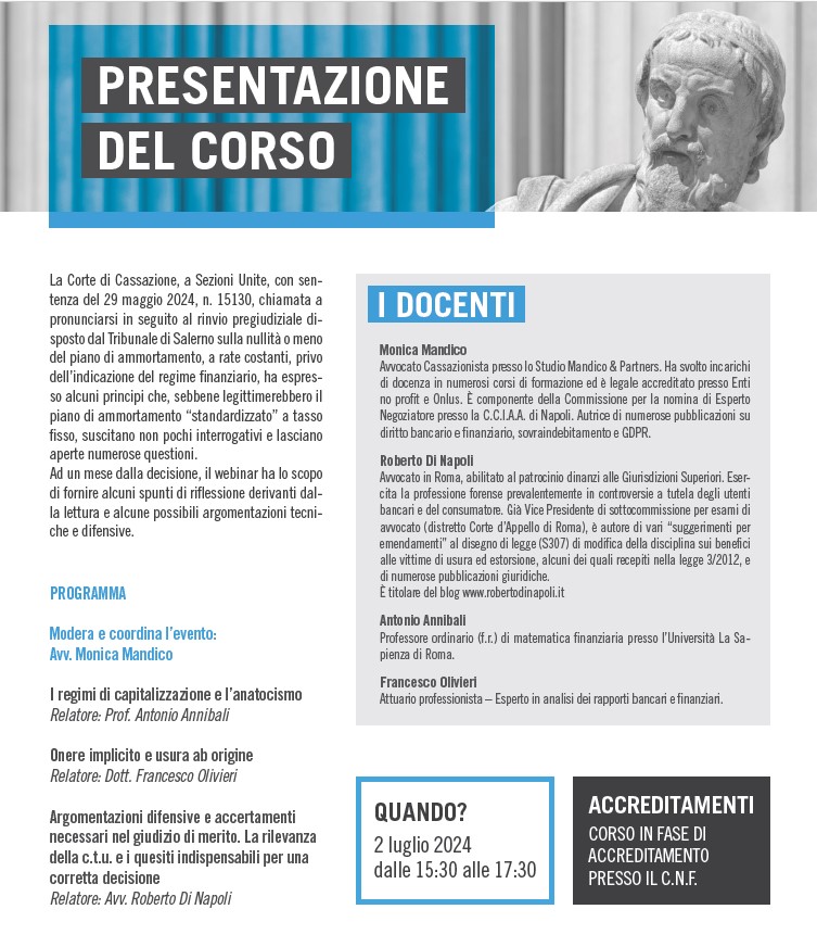 Il 2 luglio 2024, a poco più di un mese dalla decisione, sarò relatore al webinar organizzato da Maggioli Formazione con lo scopo di fornire alcuni spunti di riflessione derivanti dalla lettura e alcune possibili argomentazioni tecniche e difensive insieme all’Avv. Monica Mandico che modererà il seminario, al Prof. Antonio Annibali (professore ordinario f.r. di matematica finanziaria all’Università Sapienza di Roma) e al dott. Francesco Olivieri (matematico ed attuario, esperto in analisi dei rapporti bancari e finanziari). E’ stato richiesto l’accreditamento al CNF per il riconoscimento di crediti formativi per la formazione continua degli avvocati.