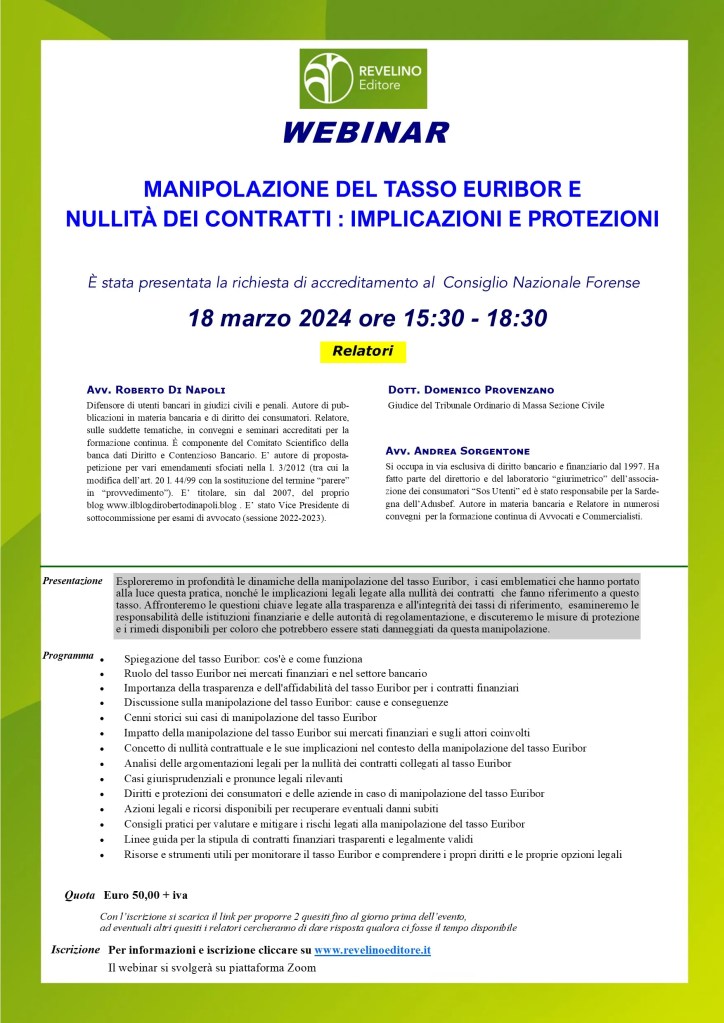 Manipolazione del tasso Euribor e nullità dei contratti. Webinar il 18 marzo 2024 organizzato da Revelino Editore