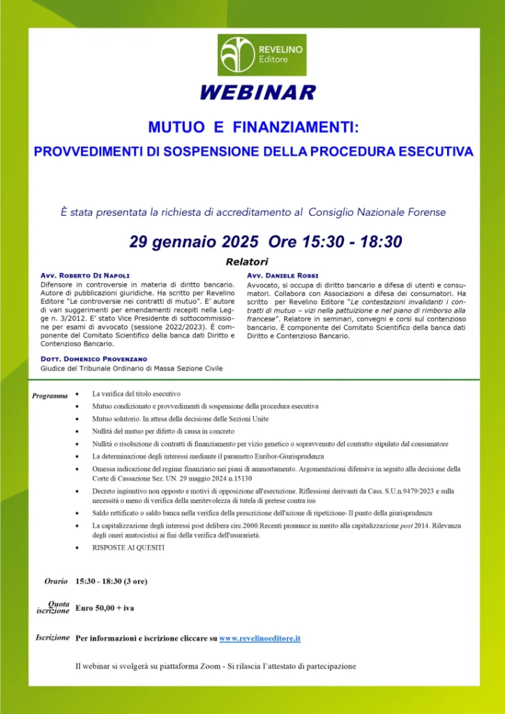 29 gennaio 2025- webinar su “Mutui e finanziamenti: provvedimenti di sospensione delle procedure esecutive”