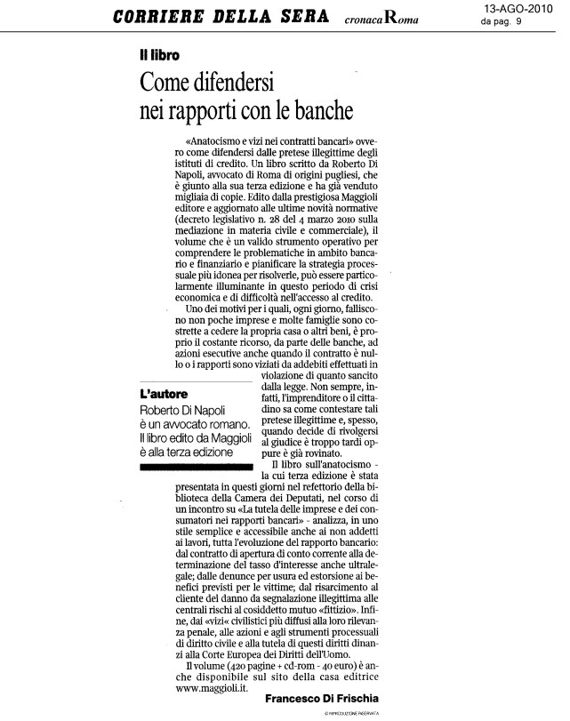 E’ appena uscita la V edizione del mio “Anatocismo bancario e vizi nei contratti“, edito dalla storica e prestigiosa Maggioli Editore che già 10 anni fa, nel maggio 2005, quando fu pubblicata la I edizione aveva compreso (dopo avere accettato, mesi prima, la mia proposta e dando fiducia ad un “giovane sconosciuto”) l’importanza del fenomeno degli abusi bancari e il dramma da cui erano e sono colpiti, soprattutto, tanti imprenditori. Arricchito con le principali sentenze intervenute negli ultimi due anni dalla precedente edizione, di nuovi paragrafi sul nuovo divieto di anatocismo, sulla “vicinanza alla fonte di prova” (e su qualche interrogativo che può destare una recente pronuncia della Cassazione) e su “possibili nuovi territori” da esplorare, quali i danni alla salute da abusi bancari (in particolare il danno psichico, paragrafo scritto con l’ausilio dell’amica psicologa e studiosa dott.ssa Luana Lentini), quest’anno il volume compie 10 anni dopo essere stato venduto in circa 10 mila copie. Scrivere un manuale o un testo giuridico non è solo un’opera di divulgazione di pronunce giurisprudenziali o di leggi la cui lettura può apparire “arida” e “noiosa”: è anche ricerca, studio, organizzazione di ciò che si ritiene possa interessare il lettore, creazione del volume cercando di contemperare l’esigenza di semplicità espositiva degli argomenti -che potrebbero sembrare complessi per chi si affaccia, per la prima volta, alla materia- con l’involontario, a volte necessario, “tecnicismo” e cercando di “far parlare” il libro con la massima semplicità possibile; è, quindi, divulgazione del proprio pensiero o anche dell’interpretazione di una determinata legge o sentenza; è, come ogni libro o come ogni scritto, anche una “proiezione” dell’autore. Non nascondo, pertanto, una piccola soddisfazione nel vedere che, in questi 10 anni, il volume è stato acquistato da circa 10 mila imprenditori, colleghi avvocati, consulenti contabili e che (come mi hanno scritto, più volte, vittime di abusi bancari) è servito per essere aggiornati sulle principali pronunce e strumenti di difesa, oltre che essere acquisito nelle principali biblioteche tra cui anche quella della Corte Costituzionale o di vari dipartimenti universitari. Sentire il lettore contento dell’acquisto credo renda felice ogni autore per il solo fatto di “sentire” la fiducia e quell’affetto di chi ha apprezzato ciò che si è scritto, di chi immagina gli sforzi, le rinunce, il tempo impiegato, di chi ti vuole ringraziare e ti sorride per l’aiuto inconsapevolmente datogli. E’ per questo, però, probabilmente, che si sente anche la non poca responsabilità in quanto si manifesta, si esterna e divulga il proprio pensiero, il proprio “punto di vista” che si materializza su carta, con una vita propria, anche distinta da quella dell’autore. Spero, quindi, che anche questa V edizione possa continuare ad essere apprezzata.